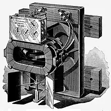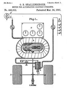 Shallenberger, through a research laboratory accident, innovated a device that led to the invention in 1888 of an induction meter,[13] a paramount apparatus of the Westinghouse alternating current system.[14][15] One day when he was experimenting on a new type of lamp a spring fell off and landed inside the lamp on a small edge of the holding structure. Before it got replaced by a co-worker Shallenberger observed that the spring rotated by some sort of electromagnetic force. He then conceived the idea that perhaps this force field could be used to turn some small wheels in such a way that they could measure electricity. Shallenberger developed that force field concept into a mechanical device that could measure alternating current usage.[16] He patented it under number US449003 A.[10] It was a type of motor.[17]