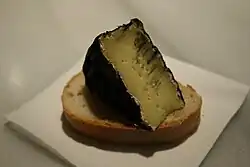 Olivet cendré, also called cendré d'Olivet, is a French cheese from Olivet, on the Loire river, in the Centre-Val de Loire region, France. The cheese is made from cow's milk[1] collected during the spring, when the cows graze along the banks of the Loire, and when their milk is believed to be the most flavorful. The cheese is then aged for at least one month;[2] but typically for three months.[3] Traditionally, the cheese was aged in containers filled with ash[1] made from burning the clippings of grape-vines from the vineyard. The finished cheese has 45% milkfat. Today, the cheese is still made in cylinders filled with ash, imbuing a gray skin on the cheese from the ash. Olivet cendré has an earthy scent, and is considered to have a delicate taste.
