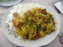 Olluquito, olluquito con carne (with meat) and olluquito con ch'arki (with dried llama meat) are traditional dishes in Peruvian cuisine made with ulluku (Quechua, hispanicized spellings ulluco, olluco) a root vegetable that also has edible leaves. It is an important root crop in the Andean region of South America, second only to the potato.[1] The leaf and the tuber are edible; the leaves are similar to spinach, and the root is like a potato or jicama. The Ulluku contains high levels of protein, calcium, and carotene. Papalisa were used by the Incas prior to arrival of Europeans in South America. It can be served with meat.[2]