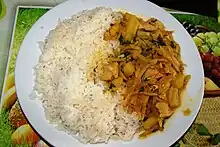 Ch'arki is the technique employed in the Andean highlands to cure meat by salting, then dehydration. Incidentally the word "jerky" in English is derived from this Andean (Quechua) word. The dish is a stew of finely diced ulluku with ch'arki pieces (traditionally alpaca, or less frequently llama meat, though today it is also very commonly made from sheep), served with white rice.