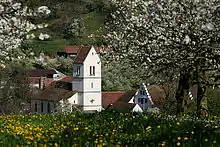 The Church of St. Niklaus is located outside and slightly above the village of Oltingen. The church is surrounded by a low wall, which encloses the church, rectory, barns and an ossuary. The church was built in 1474. In 1852, the nave was widened toward the north. The interior of the church is decorated with a series of late-gothic murals. The murals include images of Marian legends, the Last Judgement, Apostles and Saints.[15]