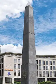 To date his art has been shown in major museums and galleries around the world including the Whitney Museum of American Art; the Whitechapel Gallery and the Barbican Center in London; Migros Museum, Zurich; the Irish Museum of Modern Art, and Bonnefantenmuseum, Maastricht, among many others; as well as in the Havana, Busan, and Johannesburg biennials, and most recently at the 2007 Venice Biennial. His public art works may be found in Germany, Japan and Korea. Oguibe has previously taught in several colleges including the University of Illinois at Chicago and the University of South Florida where he held the Stuart Golding Endowed Chair in African Art.[10][11] His monumental public sculpture, Monument to Strangers and Refugees, was commissioned for Documenta 14 (2017). The concrete obelisk, inscribed in gold with a verse from Matthew 25:35, "I was a stranger and you took me in," in German, English, Arabic, and Turkish, was designed for Königsplatz (King’s Square) in Kassel. For the work, Oguibe was awarded the Arnold Bode Prize in July 2017. In addition, a heated debate arose on social networks among organizers, journalists and other artists about the extent to which political thought and artistic work could really be separated. Oguibe's statements about the attacks on the satirical magazine Charlie Hebdo and about Hamas' actions in Israel raised strong concerns about the artist's actual moral integrity among those participating in the discussion and those who witnessed these statements.[12] The Time Capsule was also another artwork that was done by Oguibe from which both works mentioned were conceived during a refugee crisis happening during the year 2014 and 2015. This crisis was known to be a critical period in Germany history and in Europe history where hundreds of thousands of people fled wars, poverty, and other atrocities.[13]