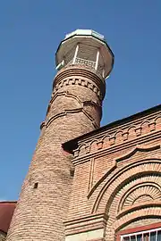 The minaret of the mosque, also built of burnt bricks, has a rounded shape. Its height is 14 m.[5] The brick patterns of the minaret, which is part of the main complex of the mosque, emphasize the skill of the master.