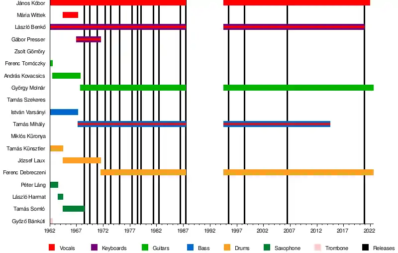 Omega was formed in Budapest in 1962 by Benkő and Kóbor, with trombonist Győző Bánkúti, drummer Tamás Künsztler, saxophonist Péter Láng, guitarist Ferenc Tornóczky, and bassist István Varsányi. The members had all been in previous bands at the same grammar school.[2][3][4] Their first concert was at Budapest's University of Technology and Economics in September 1962.[5][6] The band went through many personnel changes in its first several years, and mostly played covers of British rock songs.[1]