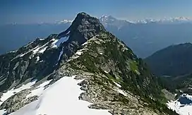 Omega Mountain is a 1,918-metre (6,293-foot) summit located in the Tantalus Range, in Tantalus Provincial Park, in southwestern British Columbia, Canada. It is situated 10 km (6 mi) northwest of Squamish, and 8.2 km (5 mi) southeast of Mount Tantalus, which is the highest peak in the Tantalus Range. Its nearest higher peak is Mount Pelops, 1.7 km (1 mi) to the west.[2] Lake Lovely Water lies below the northwestern slope of the peak with Alpha Mountain on the opposite side of the lake. Precipitation runoff from the peak drains into tributaries of the Squamish River. The first ascent of the mountain was made in 1916 by Tom Fyles and his brother, John Fyles. The mountain's name comes from Omega, in keeping with nearby peaks being named for Greek alphabet letters, namely Alpha and Iota mountains. Its name was officially adopted on June 6, 1957, by the Geographical Names Board of Canada.[3]