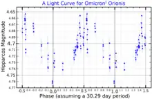 Omicron1 Orionis (ο1 Ori) is a binary star[9] in the northeastern corner of the constellation Orion. It is visible to the naked eye with an apparent visual magnitude of 4.7.[4] Based upon an annual parallax shift of 5.01±0.71 mas, it is located approximately 650 light years from the Sun. At that distance, the visual magnitude of the star is diminished by an interstellar absorption factor of 0.27 due to intervening dust.[5]