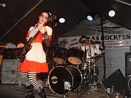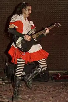 With a discography of 11 full-length albums under its belt,[5] (six One-Eyed Doll albums, four Kimberly Freeman solo albums and one under the name Ghetto Princess) the band made No. 1 on ReverbNation's local chart[6] and has toured nationally with OTEP[7][8] Cold, Wayne Static (of Static X), Peelander Z, Polkadot Cadaver, Wednesday 13, Mushroomhead, and Orgy. The band's lead singer and guitarist, Freeman (who has been described as Gwar meets Strawberry Shortcake)[9] performs on a signature Tregan guitar, accompanied by the lone drummer (and producer) Jason Rufuss Sewell a.k.a. Junior, in a theatrical style[10] which has been described musically as "... Pixies meets Siouxsie meets Hole"[11] and the "bastard laboratory love child of Dresden Dolls meets White Stripes and Marilyn Manson."[12] Lead vocalist Kimberly Freeman was featured as one of Revolver Magazine's Hottest Chicks in Hard Rock in 2011, 2012, and 2015, Guitar Player Magazine's Top 20 Most Extraordinary Guitarists and on America's Got Talent's 2010 Semi-Finals as part of ArcAttack.