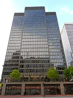 One Charles Center is a historic office building located in Baltimore, Maryland, United States. It is a 23-story aluminium and glass International Style skyscraper designed by Ludwig Mies van der Rohe and constructed in 1962. It was the first modernistic office tower in Baltimore and part of the city's downtown urban renewal movement. The base consists of a concrete-faced podium topped by a paved plaza, with the T-shaped office tower atop.[2] The tower includes metal trim and gray glass.[3]