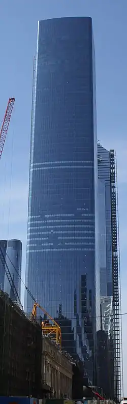 Law firm Skadden, Arps, Slate, Meagher & Flom agreed to become the building's anchor tenant in April 2015, relocating from 4 Times Square[19] to 550,000 square feet (51,000 m2) at One Manhattan West.[20][21] Brookfield decided to begin constructing One Manhattan West after Skadden Arps had signed the lease, even though the proposed building was only 25 percent leased, amid competition from the Related Companies' Hudson Yards development.[22] The building reached its halfway point in October 2017, when the first glass panels were installed on the facade,[23] and accounting firm Ernst & Young announced the next month that it would relocate to One Manhattan West.[24][25] The National Hockey League, financial services firm JPMorgan Chase, law firm McKool Smith, and professional-services firm Accenture had also agreed to move into the building by mid-2018.[26] Wells Fargo provided a $530 million construction loan for the project in July 2018.[27] The structure topped out the next month,[28][29] and the last "kicker" was installed that September.[5]