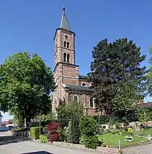 In 1910, Oos was brought into the spotlight when Germany's first passenger airship hangar was opened on the new local airfield. The hangar and its assets were auctioned off for 295.000 Deutsche Mark following the Treaty of Versailles; some parts are still used in an industrial sawmill in Auggen today.[1][2] On 30 December 1944 one third of the buildings of Oos (i.e. about 300 houses) was destroyed or heavily damaged by bombs and Saint Dionysius Church was severely damaged as well. On 2 January 1945 another air raid caused extensive damage to the railway station of Oos and to various barracks nearby.[3]
