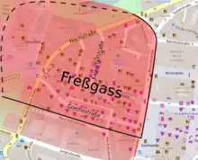 The Opera Quarter is defined as the area between the Old Opera and the central city square Opernplatz in the west and the Frankfurt Stock Exchange and the Rathenauplatz/Goetheplatz in the east, and is centered on the pedestrian main street Freßgass, its most important street. In addition to the Freßgass itself, the quarter includes Goethestraße, Kaiserhofstraße and the narrow streetlet Kleine Hochstraße, and some other smaller streetlets, and a portion of the road Hochstraße/Neue Mainzer Straße. Recently, Neue Rothofstraße has been included as well.