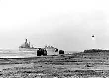 ![]() Two USMC amtracs move along a beach, with a UH-1 helicopter approaching at right. USS Washtenaw County is in the background. | |||||||