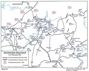 Operation Roundup was an advance by United Nations Command (UN) forces during the Korean War that took place from 5 to 11 February 1951. While achieving initial success against limited opposition, it was brought to a halt by Chinese People's Volunteer Army (PVA) and North Korean Korean People's Army (KPA) forces at the Battle of Hoengsong.