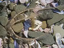 A large brittle star with long banded arms which lives partially buried in gravel seabeds. The arms are banded with light and dark brown and there is a reticulate mottled pattern of brown on the disc. The arm spines are flattened and arranged in groups of 11-12. The tentacle scales are longer than those of Ophiopsila aranea and exceptionally large, supporting the tube feet when the animal is suspension feeding. The central body is 14mm in diameter with arms approximately 10 times the disc diameter.[4][5]