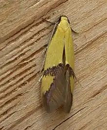 The adult moth of this species has yellow forewings each with a brown patch by the tornus and a transverse brown bar. The wingspan is about 1.3 cms.[1]