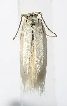 The wingspan is about 10 mm. The forewings are white; sometimes an indistinct yellowish fascia towards apex, often entirely absent. Hindwings whitish-grey. The moths fly boldly towards dusk, and come freely to lamps, from June to July depending on the location.[1][2]