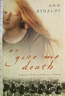 Or Give Me Death (ISBN 0-15-216687-4) is a 2003 work of historical fiction by Ann Rinaldi based on the possibility that the famous words of Patrick Henry's "Give me Liberty or Give me Death" may have been first spoken by his dying, mentally ill wife, Sarah, whom he kept locked up in a cellar to prevent her from hurting anyone. The story is told through the eyes of his daughter, Patsy Henry. It is also told by his younger daughter, Anne Henry. Patrick Henry travels throughout the Thirteen Colonies, advocating independence from Britain.