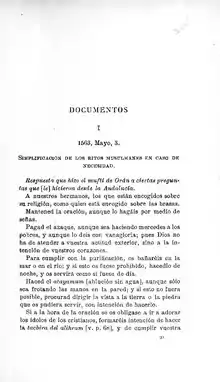 The Oran fatwa was a responsum fatwa, or an Islamic legal opinion, issued in 1502 to address the crisis that occurred when Muslims in the Crown of Castile (in Spain) were forced to convert to Christianity in 1500–1502.[1] The fatwa sets out detailed relaxations of the sharia (Islamic law) requirements, allowing the Muslims to conform outwardly to Christianity and perform acts that are ordinarily forbidden in Islamic law, when necessary to survive.[2] It includes relaxed instructions for fulfilling the ritual prayers, the ritual charity, and the ritual ablution, and recommendations when obliged to violate Islamic law, such as worshipping as Christians, committing blasphemy, and consuming pork and wine.[3]