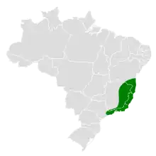 The orange-eyed thornbird is found in southeastern Brazil from southern Bahia south to northeastern São Paulo state. Within the Atlantic Forest biome it primarily inhabits humid lowland and montane evergreen forest and secondary forest but is also found near small marshes, along watercourses in woodlands, and in Eucalyptus plantations and urban areas. In elevation it mostly ranges from near sea level to 850 m (2,800 ft) but in the south of its range occurs locally as high as 1,700 m (5,600 ft).[6][7]