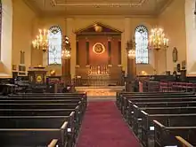 The interior is a single space, undivided by piers or columns. The eastern third was originally marked out as a chancel by means of the floor being raised by one step. The level was raised further during alterations by William Butterfield in 1871–72. The church was built without galleries, but they were soon added on three sides. Hardwick included them in his rebuilding, and the western one remains today.[4]