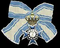 The insignia of the order is worn on the left breast and consists of a blue-enameled Maltese cross with a wide white edge, over which is placed a gold royal crown.[1] In the four angles of the cross are lozenges with the blue-and-white arms of Bavaria. At the centre of the cross is a gold bordered white circular medallion decorated with the letter T. On the back of the medallion is the year 1827 and the motto of the order “Unser Leben sey Glaube an das Ewige” (Our life is Faith in Eternity).