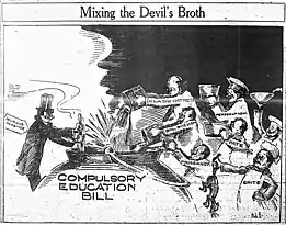 In 1922, the Masonic Grand Lodge of Oregon sponsored an initiative to require all school-age children to attend public schools.[3] With support also of the state Ku Klux Klan and 1922 Democratic gubernatorial candidate Walter M. Pierce, the Compulsory Education Law was passed by a vote of 115,506 to 103,685.[4] Its primary purpose was to shut down Catholic schools in Oregon, but it also affected other private and military schools. It was challenged in court and struck down by the United States Supreme Court Pierce v. Society of Sisters (1925) before it went into effect. The law, which was officially called the Compulsory Education Act and unofficially became known as the Oregon School Law, did not just require that children between the ages of eight and sixteen had to attend school; it required that they attend only public schools. By prohibiting children from attending private or parochial schools, the state thus forced such schools to close.