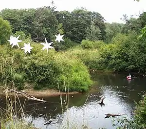 The banks of the Long Tom River decorated for the fair, as seen from the "eight" (the main path through the fair)