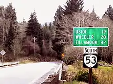 Oregon Route 53 is an Oregon state highway that runs through a pair of river valleys in the Oregon Coast range; those of the Necanicum River and the Nehalem River. OR 53 traverses the Necanicum Highway No. 46 of the Oregon state highway system.[2]