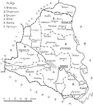 Orhei County was the successor of the Orhei District of the Principality of Moldavia or the Russian Empire in the central part, bordering on the north with the Soroca District, in the east by the river Dniester, in the west by the Bălţi District, and in the south by Lăpuşna District. The northernmost of the settlements was Poiana, in Plasa Rezina, and the southernmost was Criuleni. The capital of the county was the Orhei, and the total area of Orhei county was 4,026 square kilometres (1,554 sq mi).