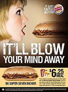 A 2009 advertising campaign in Singapore for the company's new BK Super Seven Incher cheeseburger, caused a notable controversy over the content of the ad. Originally and erroneously attributed to Burger King's advertising firm at the time, Crispin Porter + Bogusky, which had generated controversy with some misogynistic and culturally insensitive American and European advertisements,[47][48][49] it was later revealed that a local, unnamed Singaporean firm was responsible for the campaign.[50] The print version of the advertisement (pictured) made an overt association with the sandwich and oral sex using imagery and less-than subtle innuendo in the printed description in the advertisement.[51] Critics across the globe complained that the ad was "disgusting",[50][52] and went "too far".[52]
