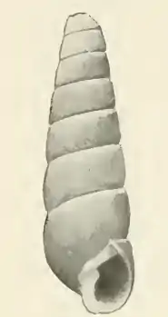 The light-brown shell has an elongate-conic shape. The length measures 6.1 mm. The two whorls of the protoconch are small. They are planorboid, having their axis at right angles to that of the succeeding turns, in the first of which they are very slightly immersed. The eight whorls of the teleoconch are almost flat, and are feebly shouldered at the summit. They are marked by very fine incremental hues, and exceedingly fine spiral striatums. The suture is moderately constricted. The periphery of the body whorl is well rounded. The base of the shell is short, well rounded, and narrowly umbilicated. It is marked like the spire. The aperture is subquadrate. The posterior angle is acute. The outer lip is thin. The inner lip is almost vertical, strongly reflected, and provided with a fold a little anterior to its insertion.[2]