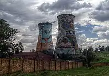 The two cooling towers are a prominent landmark in Soweto. They were built in 1951 to supplement the spray pond cooling system as this source of cooling was running at its capacity.[1]