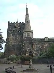 This is one of only three parish churches in England to have a tower and a separate spire, and is unique in that it has both at the same end of the building. (The other two are St Mary's Church, Purton and St Andrew's Church, Wanborough, both near Swindon, in Wiltshire). Legend has it that Orme had two sisters, one who wanted a tower, and one who wanted a spire, and Orme built both to please both.