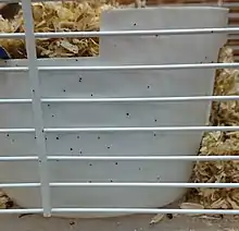 The tropical rat mite is between 0.75 and 1.44 mm in length and is unsegmented with chelicerae or mandibles which are suited to piercing.[4][3] They have a sharp caudal apex of the scutum, an oval genital shield, and a cranially positioned anus.[2] These mites are capable of parthenogenic reproduction.[6] After taking a blood meal, they are static and yellow or dark red in color. However, before a blood meal, they are more active and grey in color.[3]