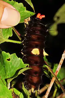 The egg is 4 mm. in diameter and light orange. Eggs are laid singly and are attached to the ventral surface of an Aristolochia leaf or a nearby object. The first instar larva is dark red wine colour. Instars 2-5 are velvet black and bear red tubercles with long black tips. The pupa is brown with a bright yellow and orange saddlemark. It has a waxy coating and two short, sharp spurs on abdominal segments 3–6.