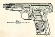 The pistol was produced in 6.35 mm, 7.65 mm, and 9 mm Kurz variants, all of which used blowback[3] as their operating mechanism. Although not expensive, at the time it was of advanced design and high quality construction with relatively few parts, well sealed against dirt. Metal components were forged or machined, and assembly in general made no use of screws, even securing the wooden grips with a spring-loaded metal fastener inside the magazine well, although some examples do incorporate a single screw for that purpose. The hammerless action depended on a spring-loaded striker to fire the cartridge. As in early Colt and Browning pocket pistols, the Ortgies striker also operated as an ejector as the slide traveled backwards after discharge.[1]