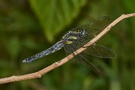 It is a medium sized dragonfly with dark face and greenish blue eyes. The thorax of old males are dark blue due to pruinescence. Its wings are transparent with dark amber-yellow tint in the extreme base. Its abdomen is pruinosed with blue color up to segment 8; last two segments are black. It breeds in marshes associated with forest streams, plantations and canals.[7][8]