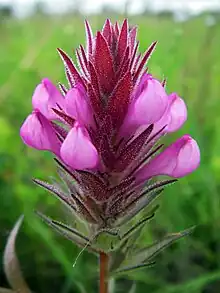 Orthocarpus bracteosus is an annual herb producing a slender, glandular, hairy, purple-green stem up to about 40 centimetres (16 in) tall.[1] The narrow leaves are up to 3.5 centimetres (1+1⁄2 in) long, the upper ones divided into three deep lobes. The inflorescence is a hairy, densely glandular spike of flowers. Each flower is bright pink to white and up to 2 centimetres (4⁄5 in) long. It is club-shaped with a pouchlike lower lip and a narrow, hooked upper lip. The fruit is an oval-shaped capsule about one-half centimetre (1⁄5 in) long containing several seeds.