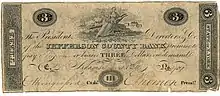 Dr. Bronson engaged his brother Ethel Bronson to sell his investment lands in Jefferson County.[42] Ethel Bronson served as President of the Jefferson County Bank from 1820 through his death in 1825, appointing Orville Hungerford as cashier of the bank beginning in 1820.[43] As a physician turned banker, Dr. Isaac Bronson instructed Hungerford in his capacity as cashier to adhere to stringent banking standards such as "make the bills of the bank always at par in New York [City] by redeeming [there]; another, never to renew a note for a customer, until the original was paid up; and a third, to refuse to discount paper having over ninety days to run."[44] By adhering to this sound money lending regime, at least for a while, Hungerford was able to maintain the bank's high profits, which made it one of the best bank investments in the state. Isaac Bronson ended up making a large profit on his sale of stock in the Jefferson County Bank.[44] In 1824, the Wall Street investment bank Prime, Ward & King, which was headed by Nathaniel Prime, purchased from Bronson half the capital in the Jefferson County Bank.[45]