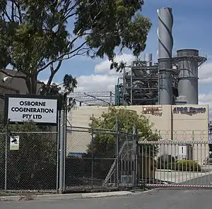 Today's Osborne Power Station is natural gas powered with one gas turbine and one steam turbine that together generate 180 MW of electricity. In addition to the electricity generated, Osborne produces 410 tonnes/hour of steam. Until Penrice closed in 2014, steam was used by Penrice Soda Products, a soda ash producer, making the power station Australia's largest cogeneration facility.[2]