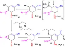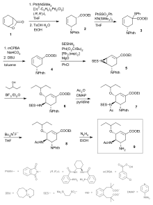 - ↑ Mita, Tsuyoshi (2007). "Second Generation Catalytic Asymmetric Synthesis of Tamiflu: Allylic Substitution Route". Organic Letters. 9 (2): 259–262. doi:10.1021/ol062663c. PMID 17217279.