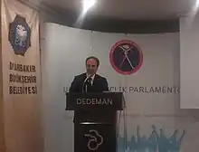 In the general elections in 2002, he was the candidate of the Democratic People's Party (DEHAP), but the party failed to reach the 10% election threshold. In 2003, Baydemir spent 6 months in the United States, to improve his English. In the local elections in 2004, he was elected mayor of Diyarbakır.[1][4] As Mayor of Diyarbakır he became a member of the World Federation of United Cities for which he toured several capitals in the world. He also held speeches about the difficulties Kurds face in Turkey to the European Parliament.[5][6] In the election campaign for the local election of 2009, he had a prominent opposition of the candidate of the Justice and Development Party (AKP) and its leader Recep Tayyip Erdogan.[7] Baydemir won the elections and declared Diyarbakir as the DTP's castle.[8] Soon after the victory in the elections of 2009, he was sentenced to ten months imprisonment for calling the Kurdistan Workers' Party (PKK) "guerrilla" which a Turkish court viewed as propaganda in favor of the PKK.[7] In the general elections of 2014 he was elected a Member of Parliament representing the BDP for Sanliurfa.[9] As an MP, he was a well perceivable defender of the Kurdish language and minority in Turkey[10] and was banned for two sessions of the Turkish parliament for using the word Kurdistan, which is forbidden to use in the Turkish parliament.[10][11] Osman Baydemir then filed an appeal before the Constitutional Court which argued it had no authority of parliamentarian penalties[12] Following, Baydemir appealed to the European Court of Human Rights (ECHR) over his temporary expulsion, who in June 2023, condemned Turkey to pay Baydemir a penalty of almost 17'000 Euros.[12]