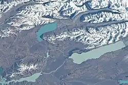 ![]() The northern Ostler Fault Zone is along the snow line at the right of this aerial view towards the south west. It is beyond milky blue Lake Pukaki, with beyond the fault, the snow covered Ben Ohau Range. The deeper blue lake in the distance is Lake Ōhau, well beyond the fault which passes at the top of the small Lake Ruataniwha in the center of the picture. The fault continues on the western side of the brown/gray Ahuriri River valley beyond at bottom left the partially snow covered Benmore Range and milky blue Lake Benmore. | |