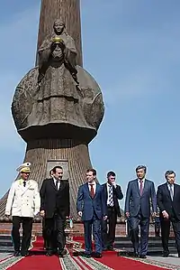 Otan Korgaushilar Monument (Kazakh: «Отан қорғаушылар» монументі; Russian: Памятник "Отан коргаушилар") is a city memorial in Nur-Sultan, the capital of Kazakhstan. It is in Defenders of the Fatherland Square near Tauelsizdik Avenue.[1] It primarily commemorates the Kazakhs who were sent to serve in the Soviet Army during the Great Patriotic War (World War II) as well as veterans of the Kazakh Armed Forces. In the Kazakh language, "Otan Korgaushilar" is the term used for "Defenders of the Fatherland". Dignitaries such as Alexander Lukashenko,[2] Moon Jae-in,[3] Angela Merkel,[4] Sadyr Japarov[5] and Kassym-Jomart Tokayev[6] have in years past visited and laid wreaths at the memorial. Victory Day Parades commonly takes place at the memorial on 9 May.[7][8]