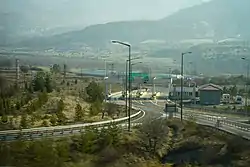 After crossing into Kocaeli, exit K6 is the Şekerpınar-Çayırova connector in Şekerpınar.[6] The O-4 traverses through northern Gebze until exit K7, which is a direct connection to the D-100.[7] After crossing over the D-100, the O-4 interchanges with the northern end of the O-5 at the unnumbered Mualimköy junction.[8] Following the junction, the motorway runs along the heavily industrialized northern shore of the Izmit Bay with exits at Diliskelisi (K8)[9] and Hereke (K9, K10).[10][11] Between Hereke and Körfez the motorway runs directly next to the D-100 and the Istanbul-Ankara railway along the shoreline until the motorway enters Körfez. Once in the city, Exit K11 connects to the D.100.[12] Shortly after K11, an unmarked exit to a KGM employee housing facility.[13] The exit is not open to public traffic although cars may use the overpass to make a U-turn. After passing a service area, the O-4 enters the city of İzmit. Exit K12 connects to the D.100 but only for traffic from/to Istanbul. The route then heads north and travels around the hilly northern perimeter of the city, passing through two tunnels and a viaduct. The O-4 crosses over the D.605, which can be accessed via Exit K12.[14] After bypassing Izmit, the motorway heads southeast, crossing over the D.100 (Exit K13[15]) in Bahçelievler. After the exit, the route enters Sakarya Province.