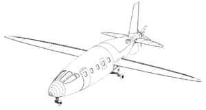 | Aircraft illustration for Otto's US9669939 patent; the prototype has a similar configuration, with air intake scoops on the upper rear fuselage and canted winglets, but without cabin windows. | |