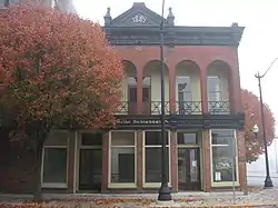 Otto Schlemmer Building is a historic commercial building located at Crawfordsville, Montgomery County, Indiana. It was originally built in 1854, and renovated to its present form in 1889. It is a two-story brick building with wood and pressed metal trim. The front facade features an arcade of six two-story, round-headed brick arches that form a gallery at the second level. The use of the Roman arch, denticulated frieze, bracketing, and a projecting central pediment are reflective of the Victorian Renaissance style.[2]: 2, 5