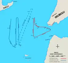 By December, the fleet had been reorganized; Nümune-i Hamiyet was assigned to II Division, along with Mecidiye, Gayret-i Vataniye, and Yarhisar.[13] On 14 December, Nümune-i Hamiyet was involved against operations against the Greek fleet in the Aegean Sea; the Ottomans had received faulty reports that the Greek armored cruiser Georgios Averof had run aground off Imbros, so Mecidiye and several destroyers, including Nümune-i Hamiyet, were sent to try to attack Greek vessels in the area. A running battle between Mecidiye and five Greek destroyers ensued, though Nümune-i Hamiyet did not take part in the engagement. Neither side inflicted serious damage on the other, and after the ships disengaged, Nümune-i Hamiyet sent a report of the action to the a naval station at Nara, since Mecidiye's radio had been disabled. The Ottoman ships then regrouped and returned to the safety of the Dardanelles.[14]