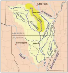 | The upper Saline River (drainage basin in dark yellow) and a few small tributaries of the Ouachita River are the only known water systems Ouachita madom is found in. | |