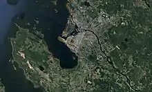 Oulu is located in northern Finland, a considerable distance from the other cities in the country. It is located 607 kilometres (377 mi) north of the capital city Helsinki. Mainland Finland's northernmost and southernmost points are roughly equidistant from Oulu. Oulu's coast sits at the Bothnian Bay (Perämeri in Finnish) and the Swedish mainland is about 180 km directly west across the Bothnian Bay. From the center of Oulu in the direction of Oulunsalo, there is Kempeleenlahti, a smaller but wide, meadow-belted bay,[21] and part of it has been listed as a nature conservation area.[22] The nearby island Hailuoto is just off the coast, 53 kilometres (33 mi) away in the Bothnian Bay. Along the coast to the southwest, about 75 kilometres (47 mi) of Oulu is Raahe (Brahestad), known for its historic wooden town, and about 130 kilometres (81 mi) of Oulu is Kalajoki, known for its popular sandy beaches.